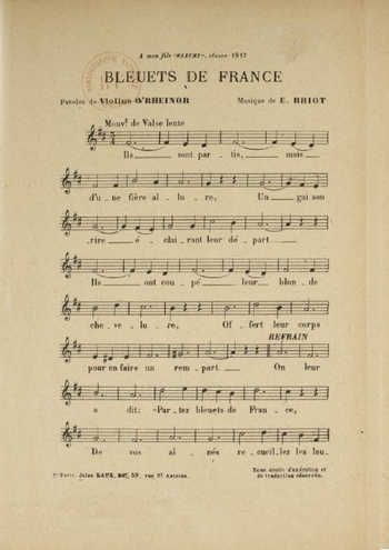 Existe encore une troisième chanson sir le même thème, de Prosper MORTOU. Chanson plus martiale dans laquelle le "Petit bleu" donne son sang vermeil...":